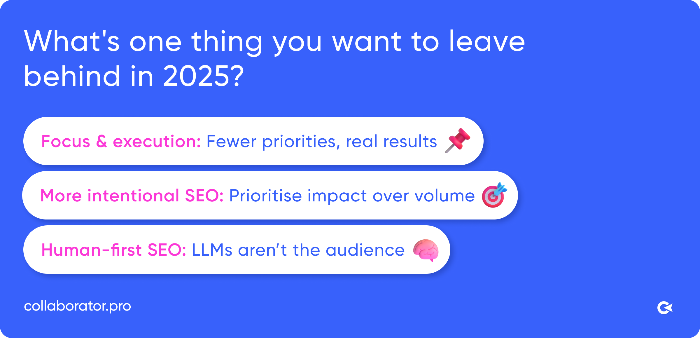 When reflecting on what to leave behind in 2025, experts consistently pointed to unnecessary complexity and distraction. Many want to move away from chasing every new tactic, overthinking decisions, and spreading efforts too thin with little to no impact. Everyone is tired of vanity metrics, forced optimizations, and low-value practices. Spammy outreach, unnecessary content, and obsessing over LLM tweaks at the expense of real users came up again and again as things that need to go.
